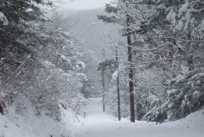 木々に雪が積もって遠くまで白黒の幻想的な景色が広がります