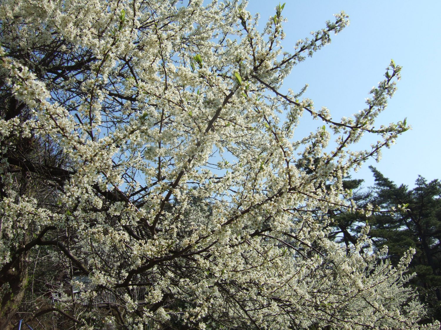 杏子の花が真っ白に空に映えて、美しいです。