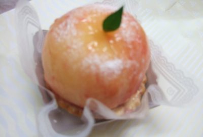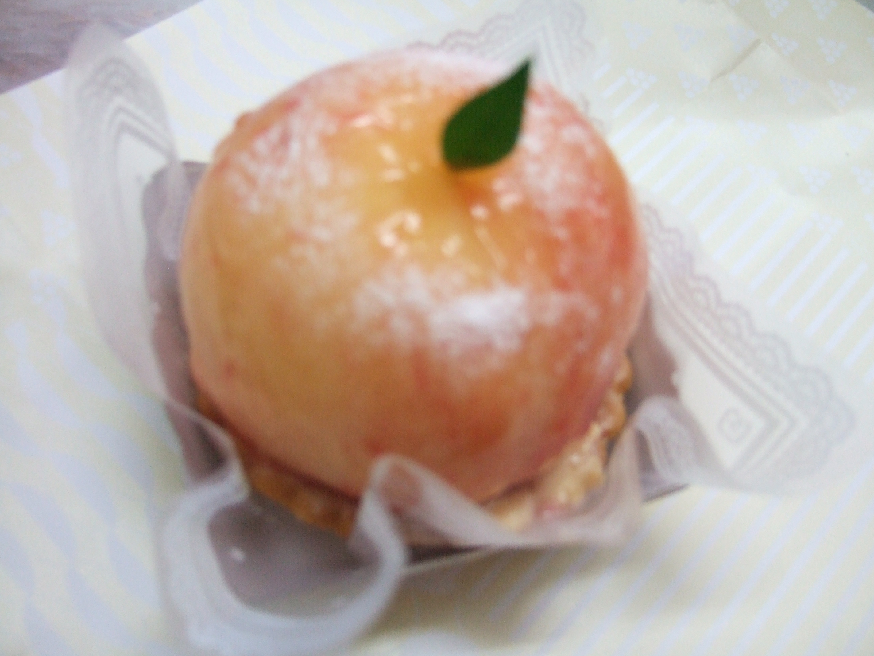 桃のケーキ(*^▽^*) 桃がまるごと1個使われていて、種の部分にカスタード